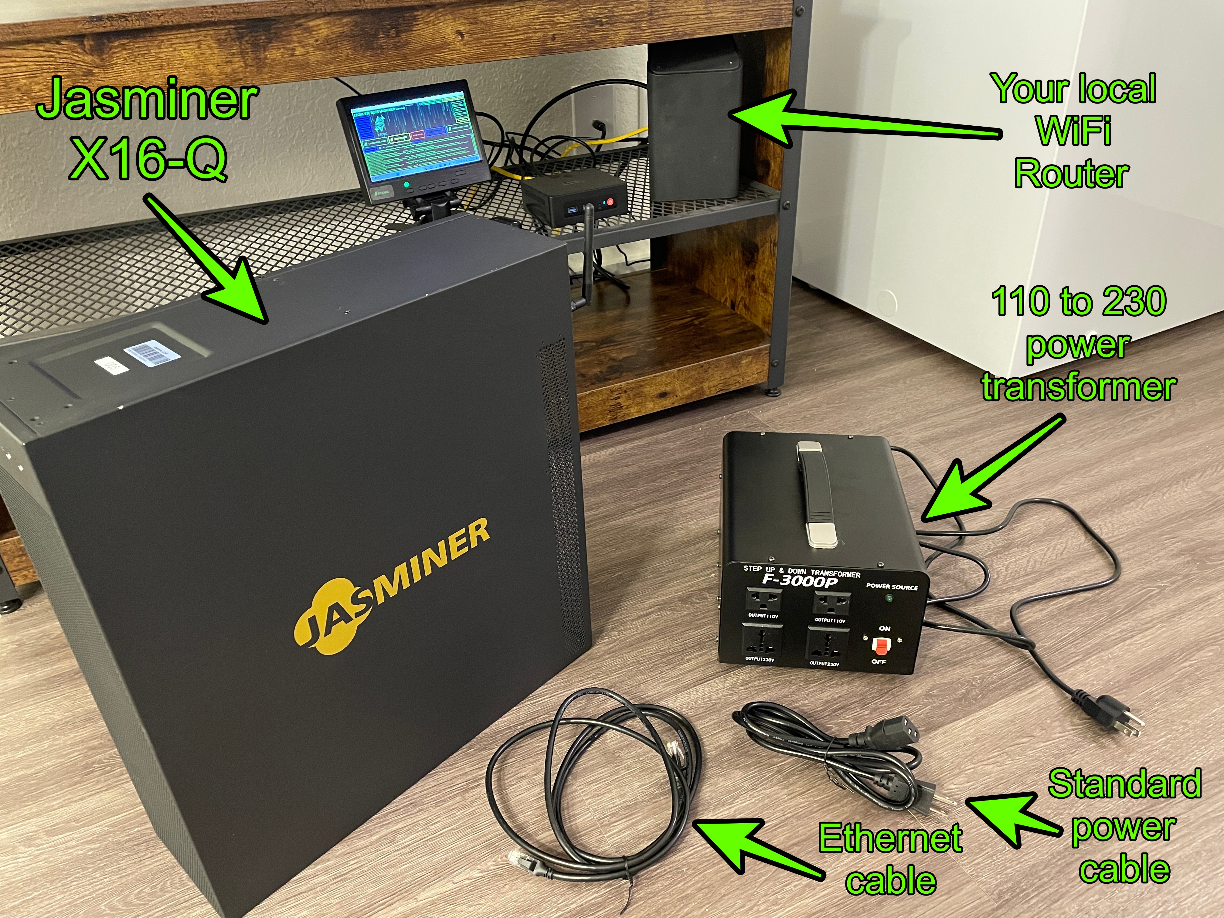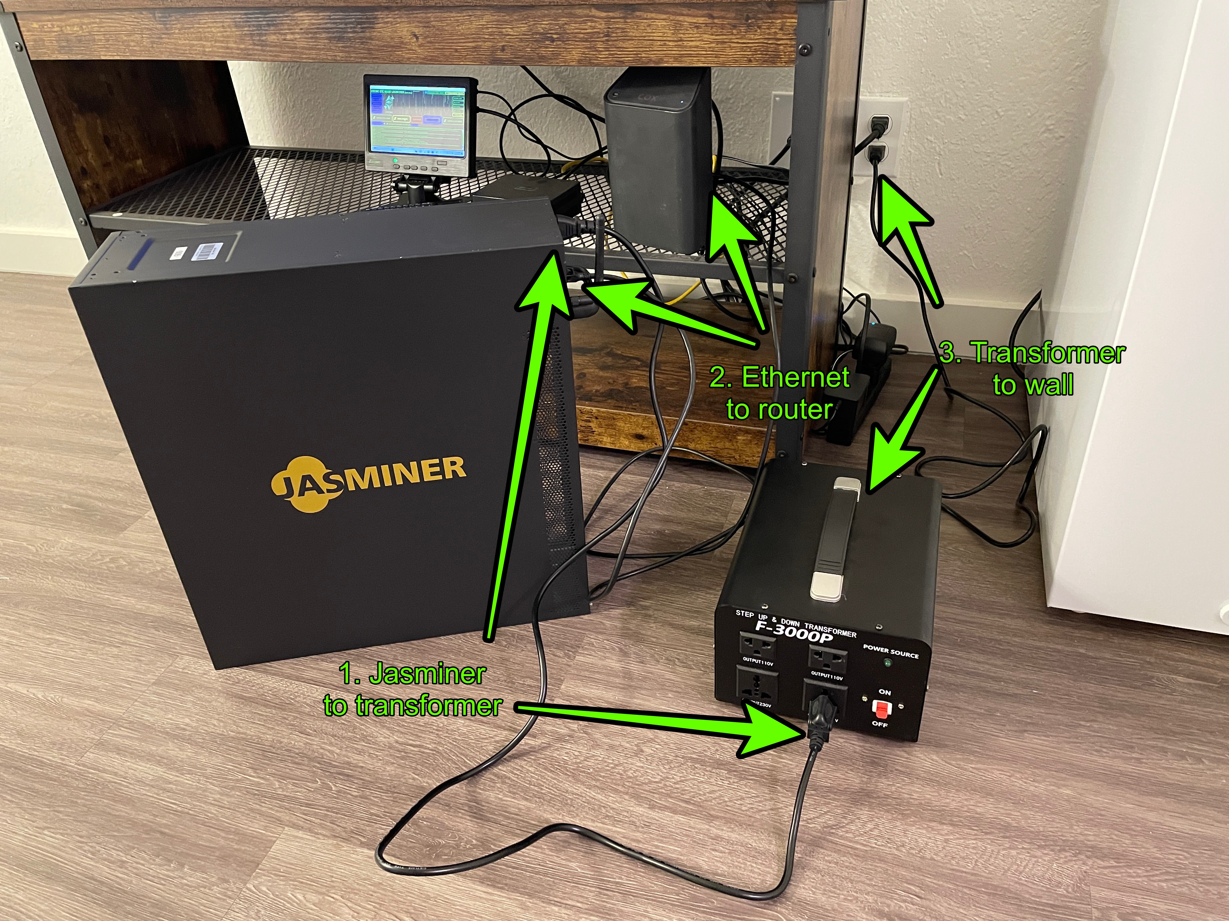 We also need a power step up transformer because in our location in Oklahoma, USA we have 110 volt electricity, but the Jasminer uses a 200 to 240 volt input.